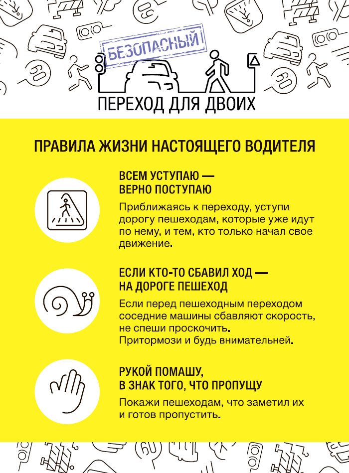- с водителями транспортных средств - по соблюдению правил проезда регулируемых и нерегулируемых перекрестков, снижению скоростного режима при подъезде к пешеходным переходам, особенностям вождения при перевозке детей, при ухудшении погодных условий, маневрировании, запрета на передачу права управления транспортным средством лицам, не имеющим права управления или лишенным такого права, находящимся в состоянии опьянения;